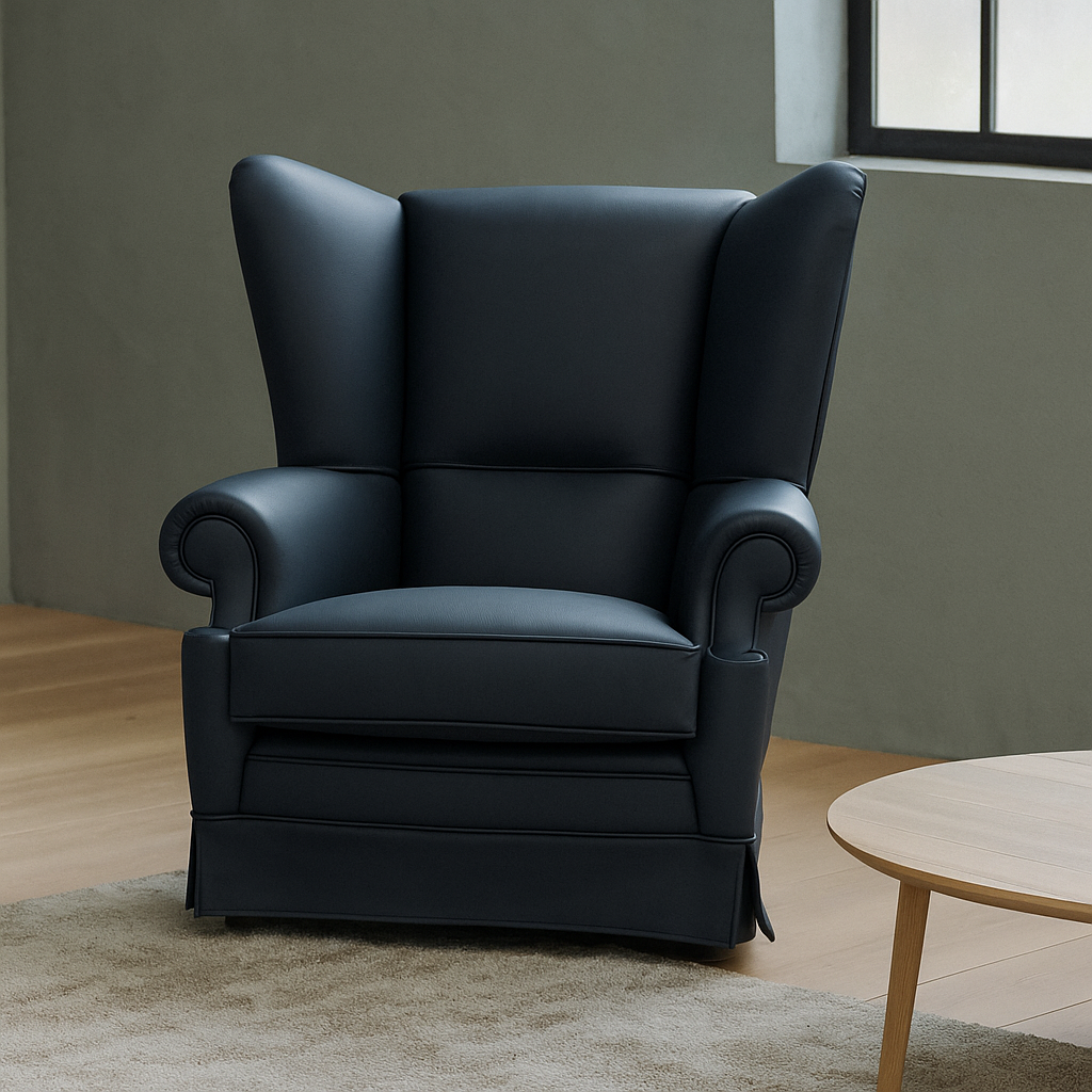 I braccioli arrotondati, lo schienale alto con orecchie laterali e la base a gonnellino disegnano una silhouette raffinata, perfetta per ambienti classici ma capace di dialogare anche con interni più moderni, come elemento di contrasto sofisticato.